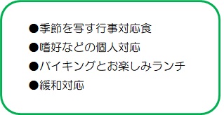 また、身体に必要な栄養と食を通じた楽しみの提供と、安全は食事形態の工夫で、毎日の生活を支える身体の維持をお手伝いいたします。