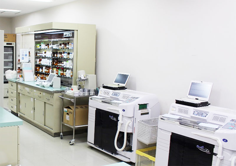検査室では、血液・尿などの成分を測定する検体検査と利用者様の身体の状態を直接検査する生理機能検査を実施しています。信頼性の高い検査結果を迅速かつ的確に臨床へ提供することにより診断・治療に寄与することに努めています。