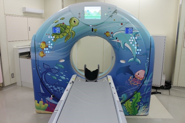 CT検査とは、エックス線を使って身体の断面を撮影する検査です。体内の様々な病巣を発見することができます。センターのCT装置は2020年12月に新しくなり、これまでの装置に比べ、検査時間の短縮、検査時の放射線被ばく軽減に加え、高画質な画像を提供することが可能となりました。さらに、利用者様が検査に対して安心できるよう、CT装置と壁面に「海」をテーマとしたラッピングを施しました。