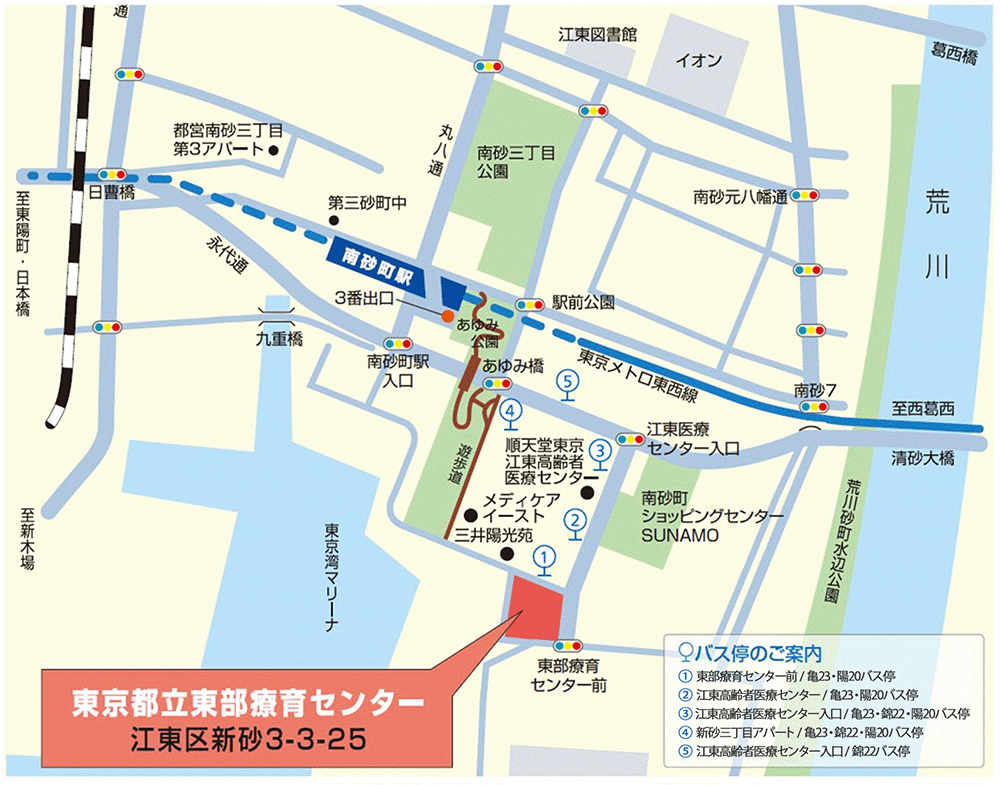 電車利用の場合 東京メトロ東西線 「南砂町」駅下車 5番出口 徒歩10分 ※東京メトロ東西線南砂町駅は改良工事のため令和6年5月13日より駅のレイアウトが変更になっております。センターへご来院の際は新設された出入口5をご利用ください。 バス利用の場合 都営バス【亀23系統 江東高齢者医療センター ~ 亀戸駅前】 都営バス【錦22系統 臨海車庫 ~ 錦糸町駅前】 都営バス【陽20系統 東陽町駅前 ~ 東大島駅前】 |